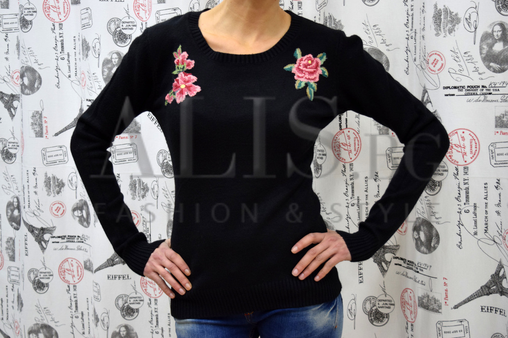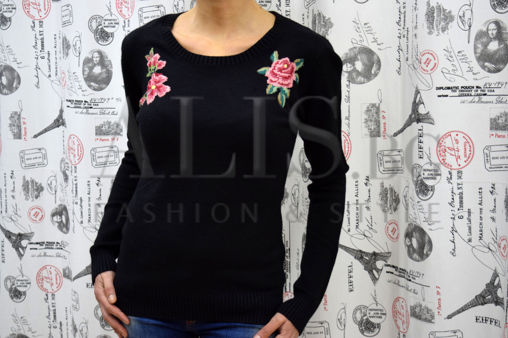 Блузата има интересни, цветни флорални мотиви в горната част.
