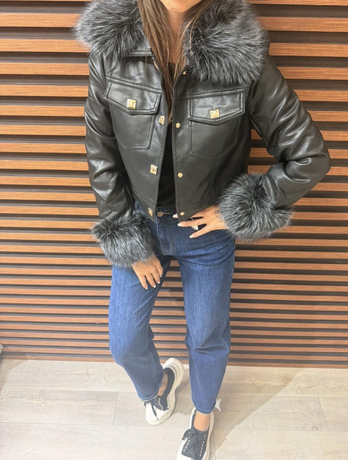 Дамско късо зимно яке с ЕСТЕСТВЕН КОСЪМ-21206-многоцветно