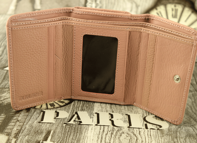 Практичен и удобен портфейл в бледо розов десен, съдържащ: